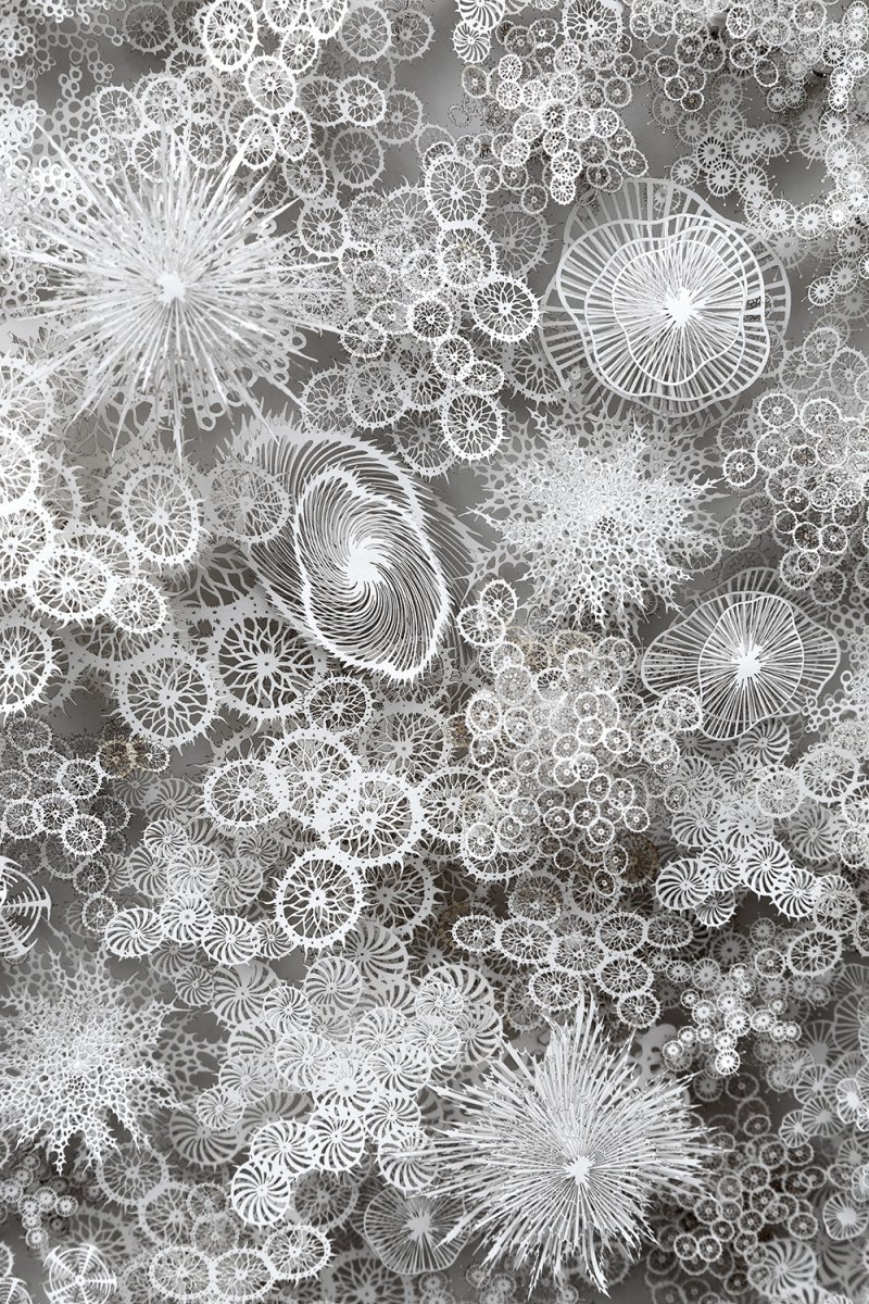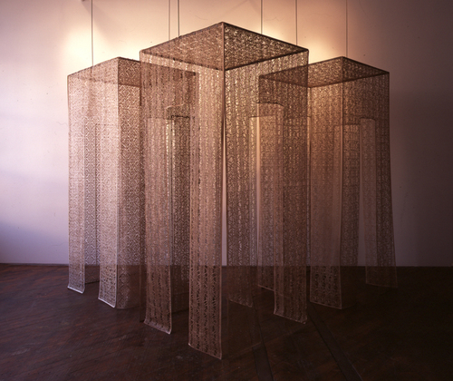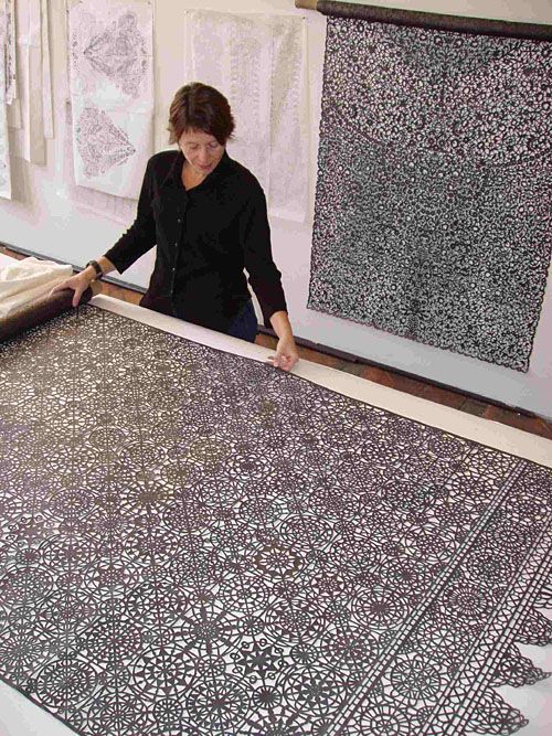 Piper Shepard takes graphite coated muslin and cuts out her designs by hand which is extraordinary considering the minute details and perfect repetition of style. Not only do I admire her craftsmanship and dedication to create such beautiful pieces of work but I love her meaning behind her work as she states.'I am investigating the physical tolerance and qualities of cloth, considering cloth as a skin or membrane; understanding our knowledge of it as fugitive, with its abilities to sustain, absorb, hold history and memory.'